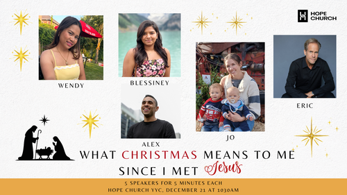 Don't miss this Sunday, Dec 21st, as we have 5 speakers sharing for 5 minutes on what Christmas means to them since they met Jesus! Each speaker comes with their own unique story of transformation in the true meaning of Christmas - meeting Jesus personally!
